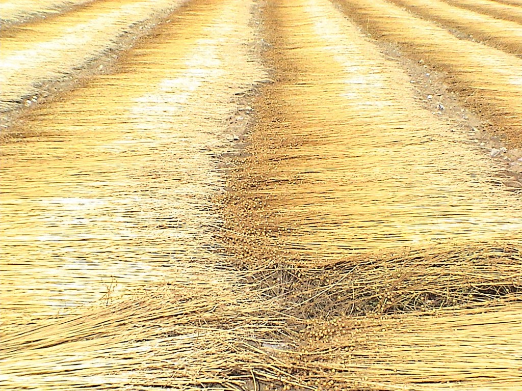 Le rouissage à même le sol : les tiges sont étalées pendant une vingtaine de jours. C’est notamment la rosée matinale qui va activer l’action des micro-organismes. Les tiges sont retournées régulièrement.
