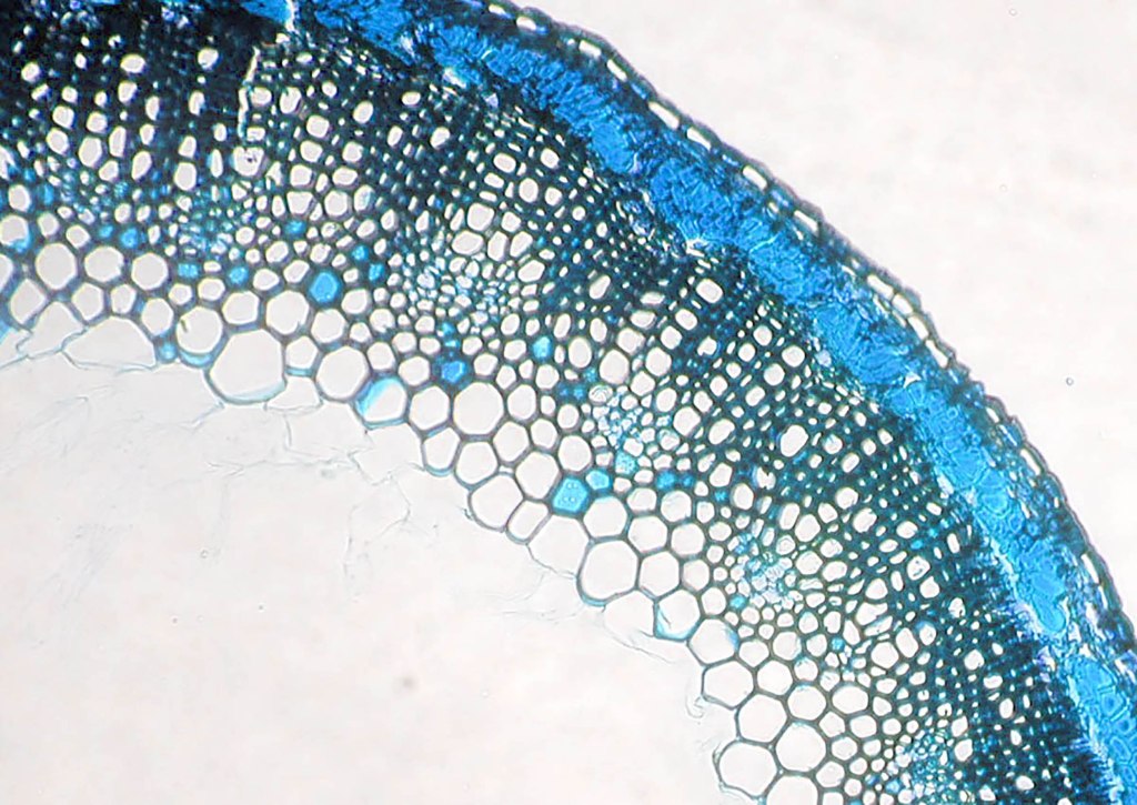 Cette image représente une section de tige de lin vue au microscope. Le lin est une plante importante pour les textiles et elle intéresse donc beaucoup les archéologues.