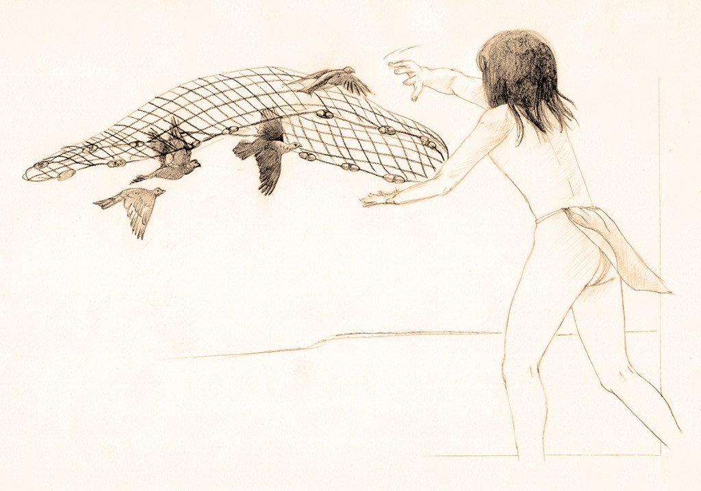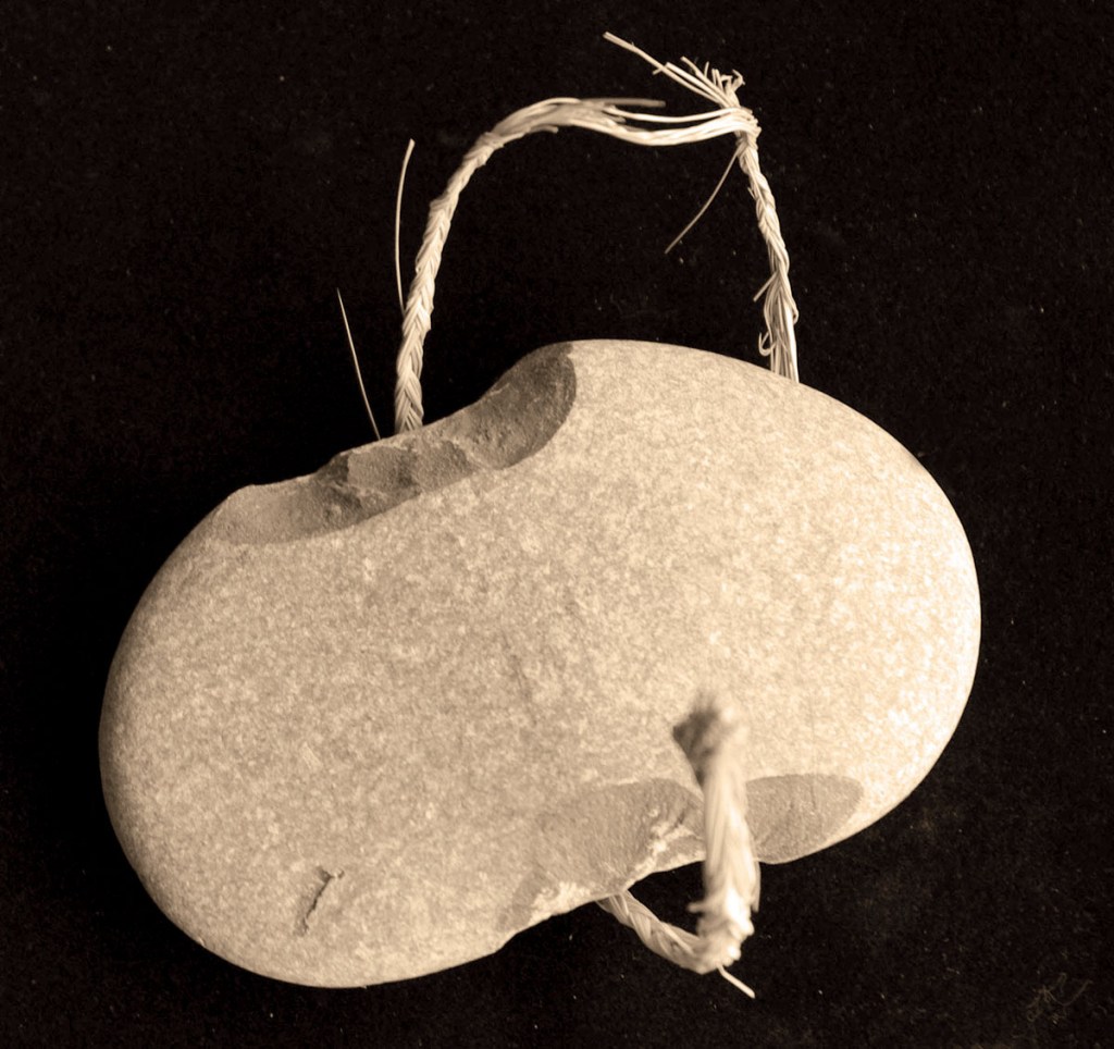 L’ethnologie nous donne quelques exemples. Ainsi chez les amérindiens Pomo, des filets lestés de galets à encoches pouvaient servir à attraper des oiseaux, comme sur l’illustration ci-dessous.