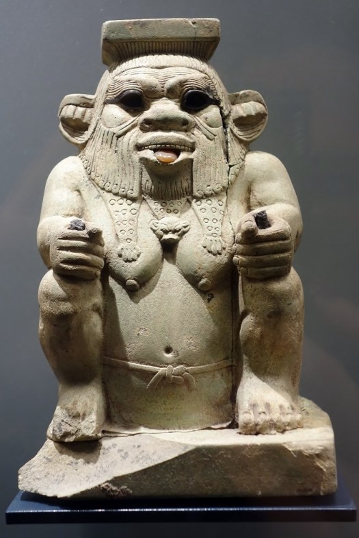 Je suis Bès ! Une divinité apotropaïque, c’est-à-dire destinée à détourner le mauvais sort. Bien connue en Égypte antique, je protégeais les femmes enceintes, mais j’étais aussi associé au vin, à la fête.