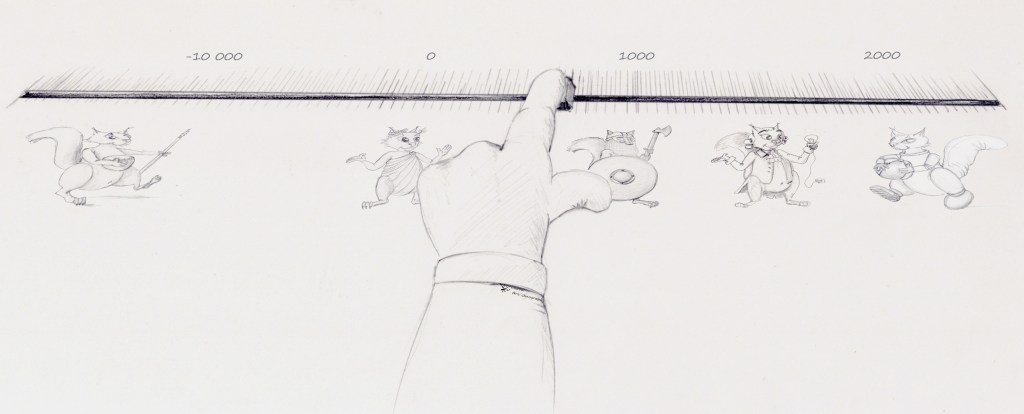 Le cadran de notre Chacureuil ne respecte pas les échelles de temps. À partir de l’an 0 de son calendrier (le calendrier chrétien, utilisé en Europe notamment), il se passe 2000 ans. Il les a représentés vers la droite. Mais vers la gauche, il a déjà placé – 10000 ans, a peu près à l’apparition des premières sociétés d’agriculteurs et de pasteurs donc, mais s’il veut remonter jusqu’au début de la Préhistoire il va falloir compter en millions d’années !