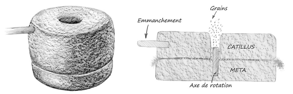 Les plus petites sont aussi les plus anciennes il s’agit de meules rotatives manuelles. Elles sont formées par deux pièces. La première – meta – est dormante (elle ne bouge pas) et elle est percé d’un trou au centre. LA seconde – catillus – est mobile et tourne sur la première. Sur le catillus un manche en bois permet d’actionner la rotation.