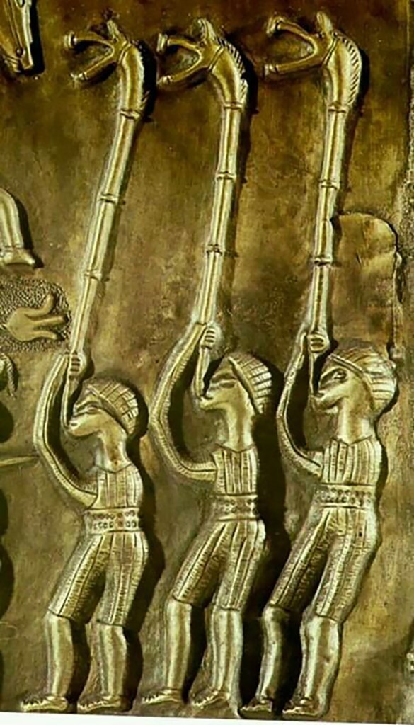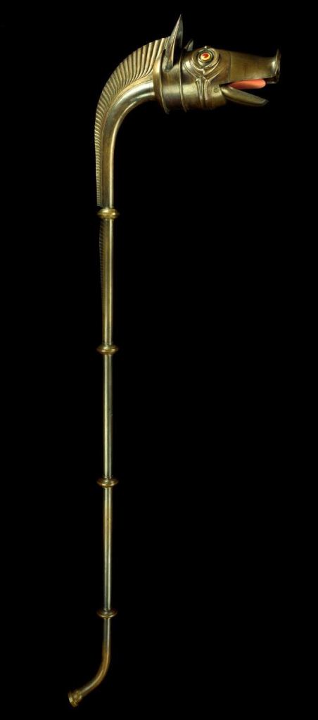 Ce bel instrument, imposant, est un Carnyx, un instrument à vent typique des populations celtiques. Il s’apparente au cor et il est lié à la guerre.