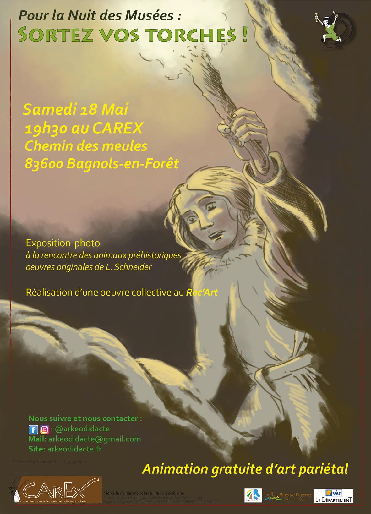 A l’occasion de la nuit européenne des musées, Arkéodidacte vous invite à participez à une soirée un peu spéciale au CAREX. A partir de 19h30 on vous invite à découvrir l’exposition « Safari Préhistorique » réalisé par L Schneider et à participer à une œuvre collective en nocturne au Roc-Art.