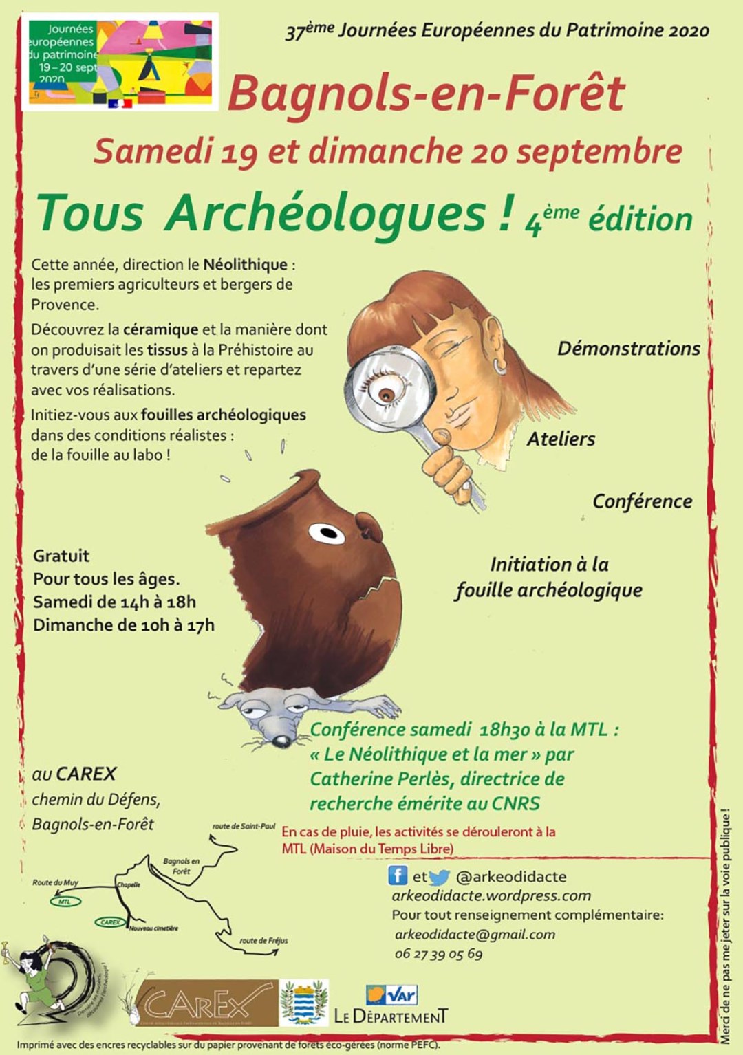 Louise Purdue, chercheuse au CNRS au CEPAM à Nice présentera une conférence sur les recherches qu'elle conduit dans la vallée du Jabron entre Comps-sur-Artuby et Trigance. Conférence gratuite, samedi 31 octobre 2020 à partir de 18h30, foyer municipal de Bagnols en Forêt, boulevard du Rayol. En raison des normes sanitaires le nombre de place est limité : réservation nécessaire par mail : arkeodidacte@gmail.com
