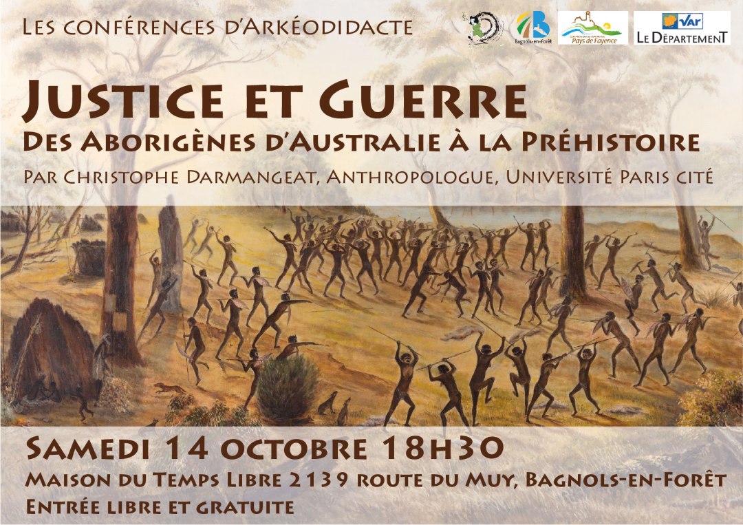 Conférence de Christophe Darmangeat le 14 octobre à 18h30 à la Maison du Temps Libre de Bagnols-en-Forêt (2139 route du Muy) La conférence est gratuite et ouverte à toutes et à tous. Pour les parents, une garderie sur place est proposée pour le temps de la conférence. Elle est gratuite, mais nous vous demandons juste … Lire la suite de Justice et Guerre. Des Aborigènes d’Australie à la Préhistoire