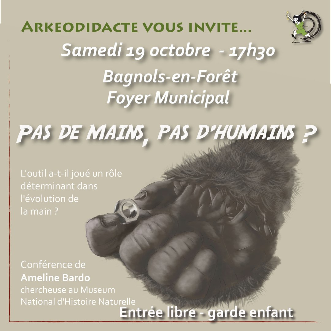 L’outil a-t-il déterminé l’évolution de notre main ? Samedi 19 octobre, à 17h30, au Foyer Municipal de Bagnols-en-Forêt (Boulevard du Rayol). Chaque jour, nous manipulons des outils variés pour accomplir une multitude d’activités, sans penser que cette capacité propre aux humains est inégalée dans le reste du règne animal. D’où nous vient cette capacité ? … Lire la suite de 19 Octobre 2024 / Conférence « Pas de mains, pas d’humains ? »