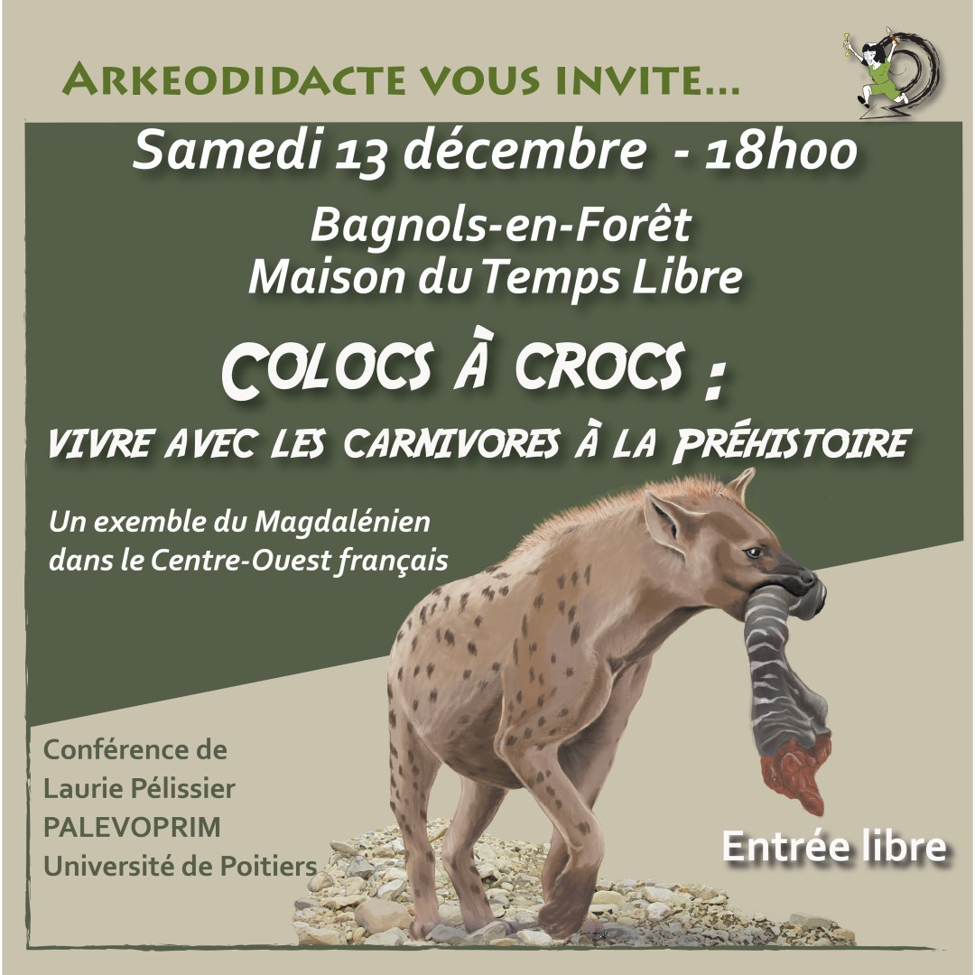 Samedi 13 décembre à 18h00 à Bagnols-en-Forêt, nous vous attendons nombreuses et nombreux pour une conférence grand public, gratuite, autour d'un thème original : la cohabitation entre les humains et les carnivores. Laurie Pélissier, doctorante à l'université de Poitiers viendra nous parler de ses travaux sur les relations entre humains et carnivores durant la Préhistoire. … Lire la suite de Colocs à crocs… vivre avec les carnivores