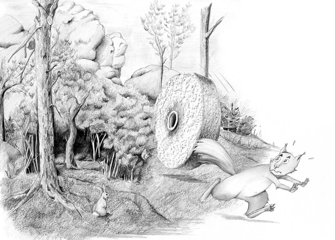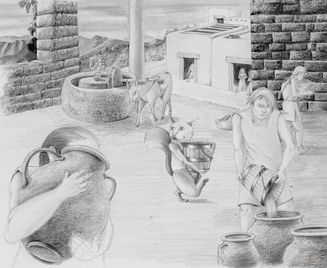 Notre Chacureuil a décidé de s’attarder chez les gaulois de Bagnols-en-Forêt. Après avoir découvert une fabrique de meules, il a voulu voir à quoi servaient ces énormes pierres. Le voilà donc dans une huilerie du deuxième Âge du Fer.